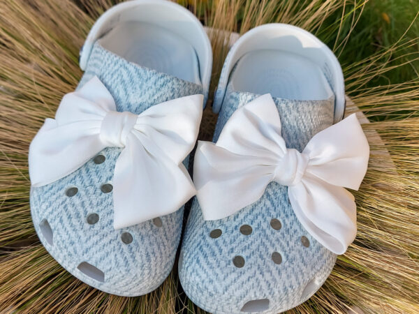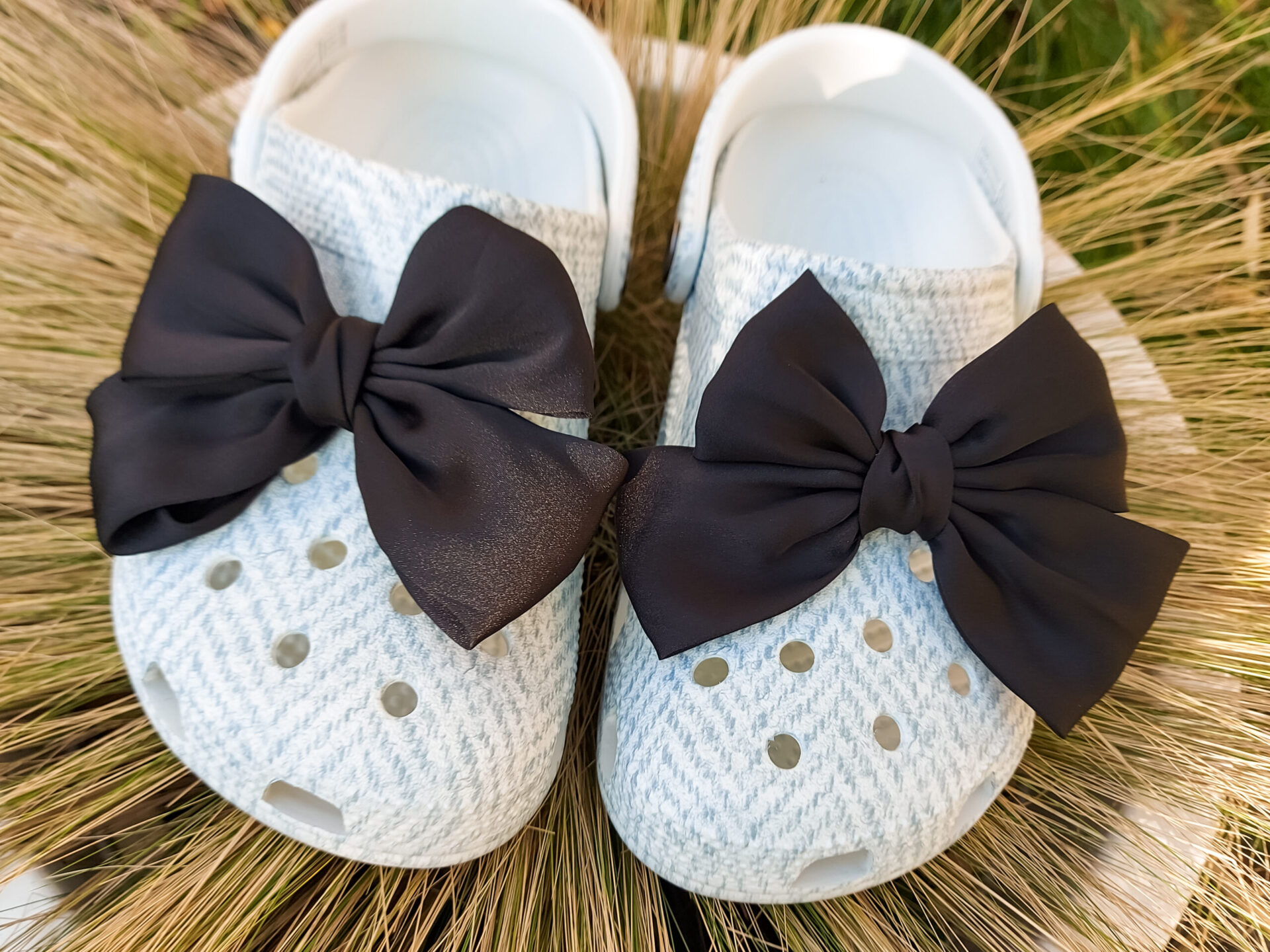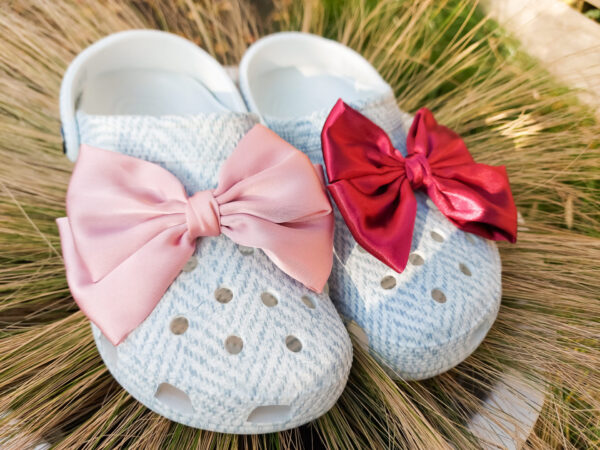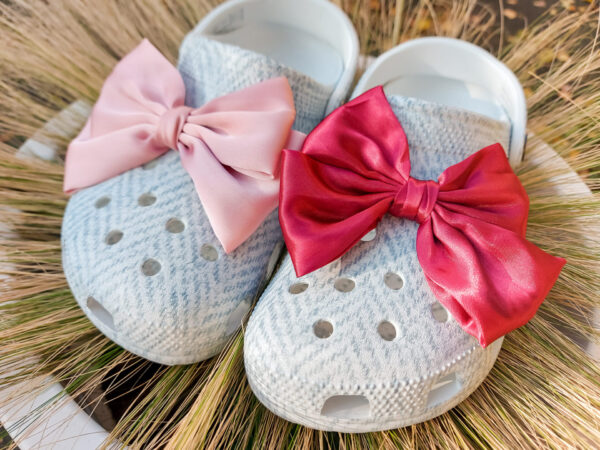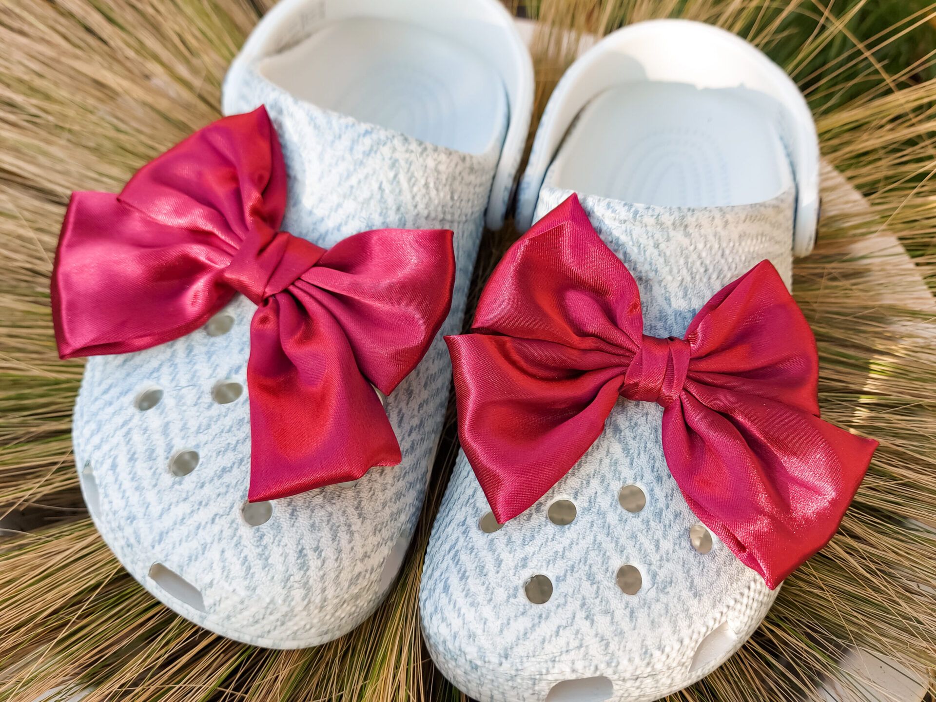 Check out these charming satin bow charms! Available in a fancy white, black, pink and burgundy red, these delightful charms add a touch of elegance and style to your footwear.